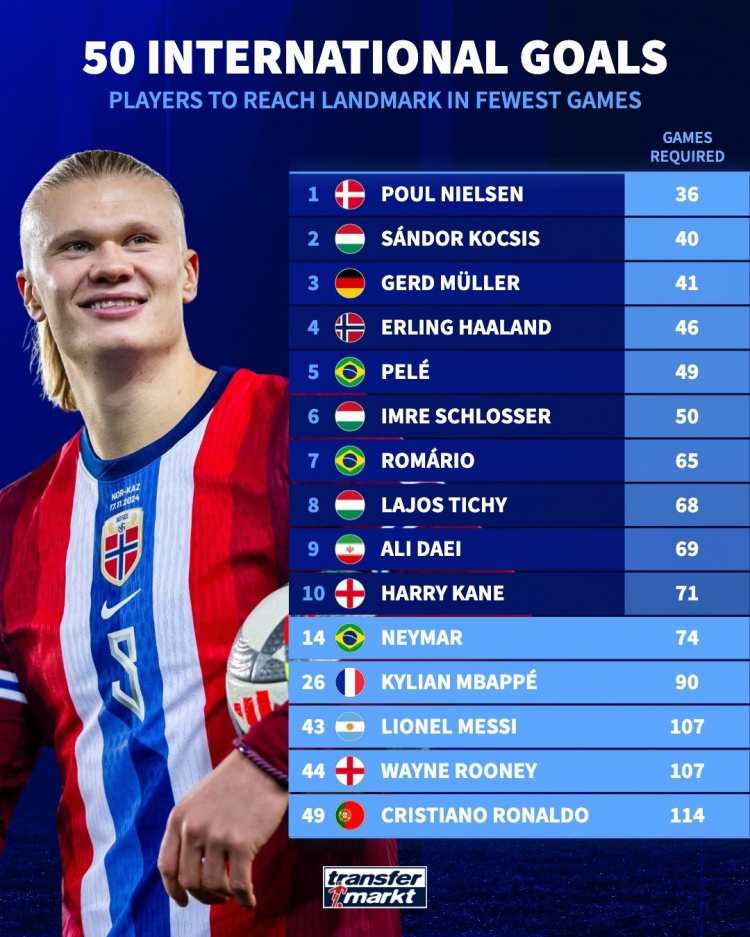 国家队最快达50球所用场次:哈兰德46场第4、梅西107场和C罗114场